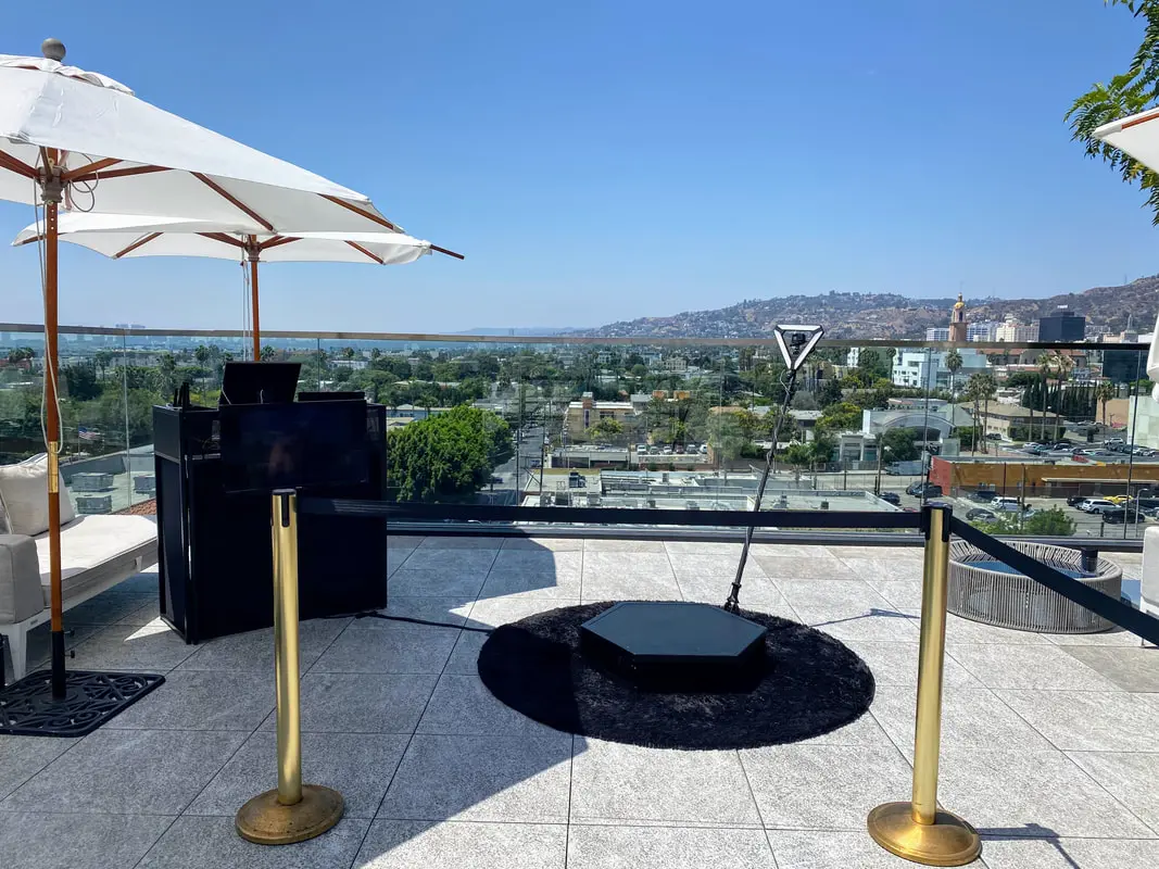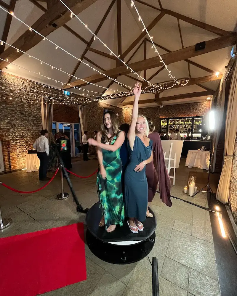 Le photobooth 360° repose sur un concept radicalement différent. Les participants montent sur une plateforme surélevée, et un bras mécanique équipé d’une caméra tourne autour d’eux pour produire un clip vidéo immersif au ralenti. Le résultat est un contenu dynamique, spectaculaire, conçu pour la viralité sur les réseaux sociaux.